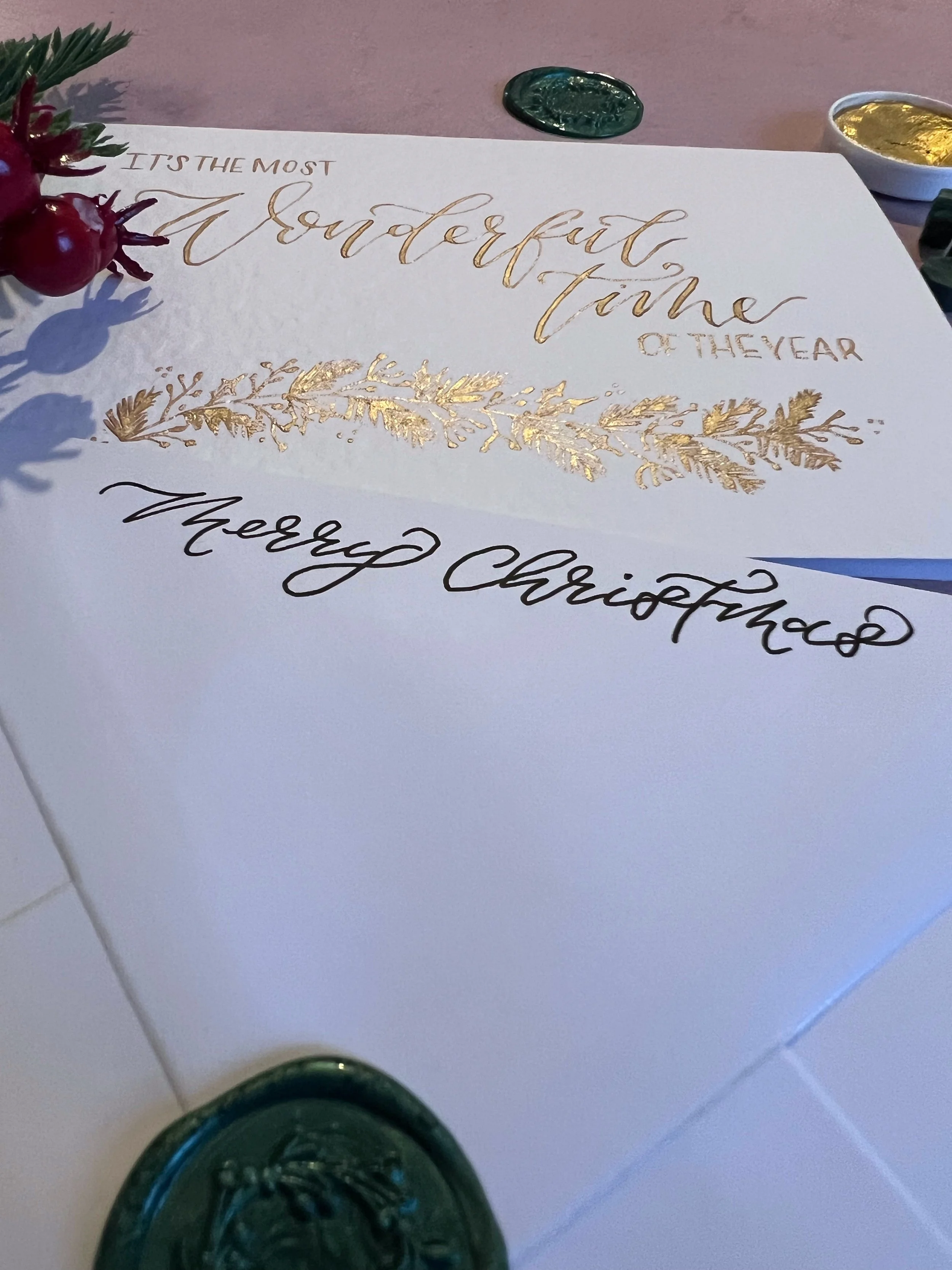 We will begin with an introduction to modern calligraphy techniques, some warm up strokes before practising the alphabet and then moving on to some Christmas words and styles so we can create our own special Christmas cards & gift tags. There will be full guidance throughout and I will be there to help you and answer any further questions you might have.