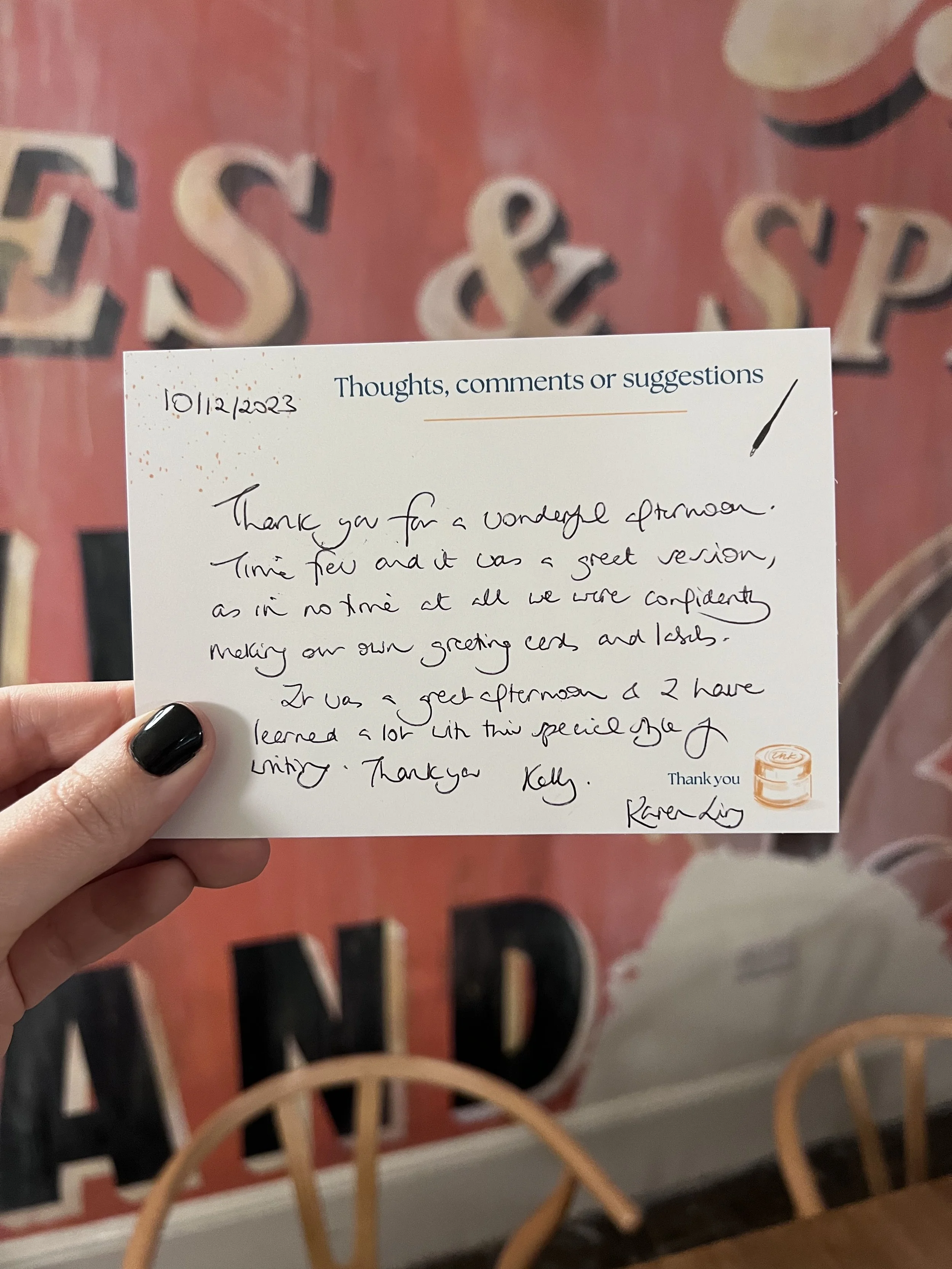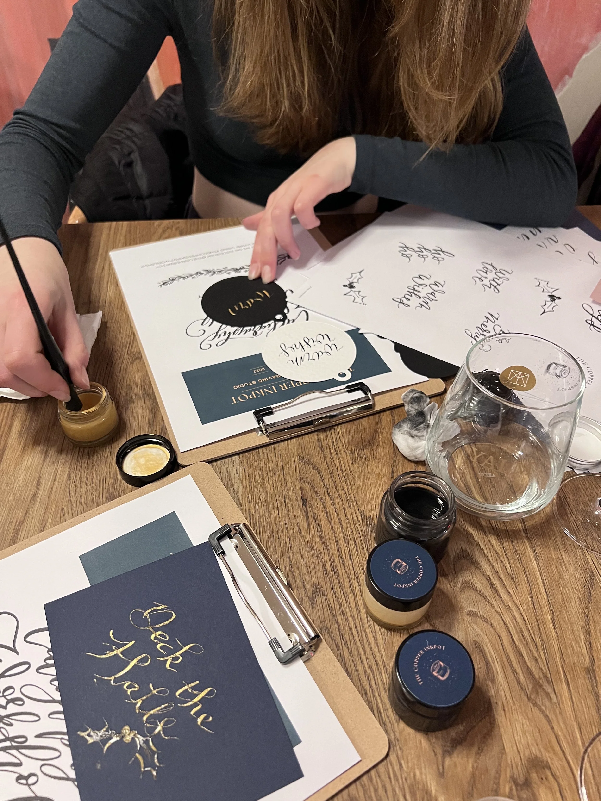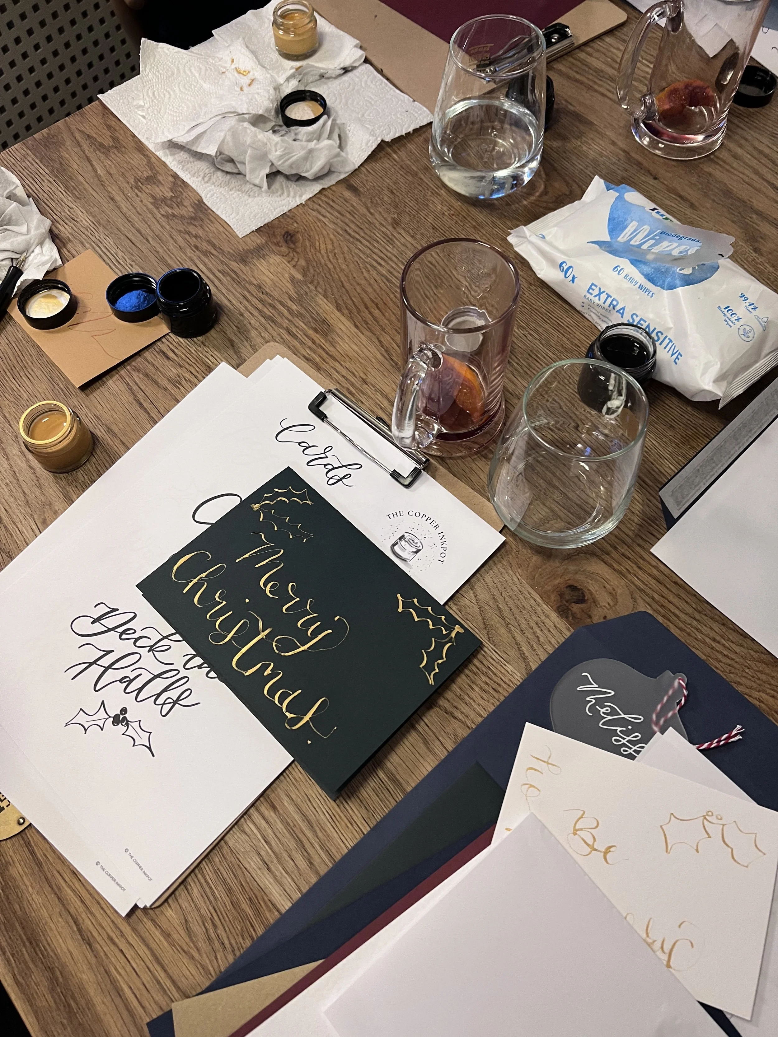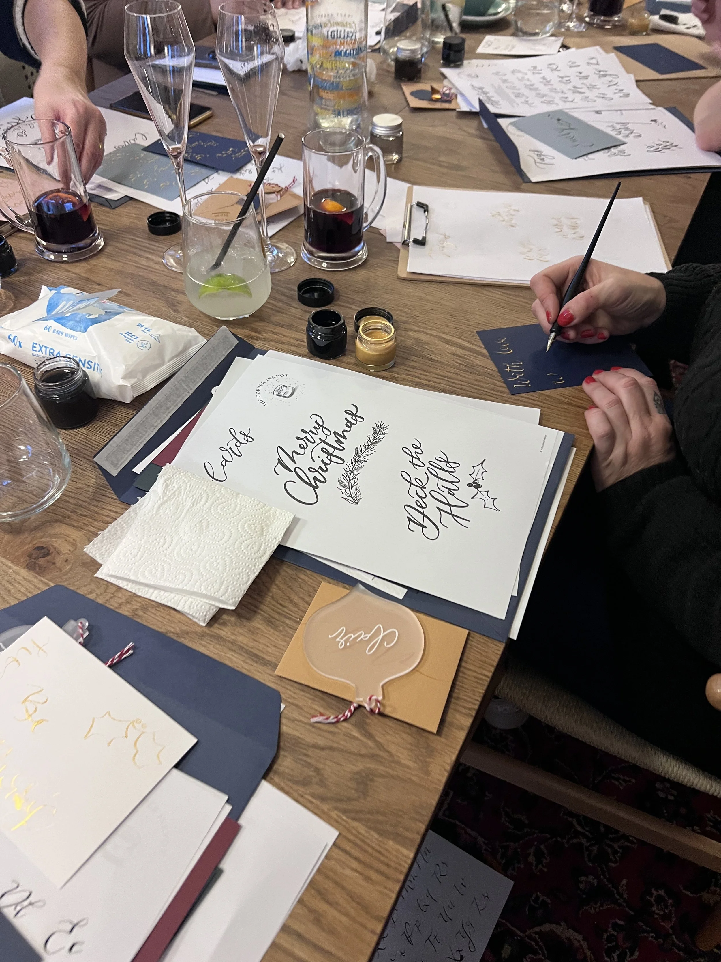 A two hour workshop - you can take some time out and spend some time on your own, or come with friends and family to try your hand at a new skill. A beginners calligraphy kit is included for you to keep and take home as well as your final work. Festive drinks are also included.